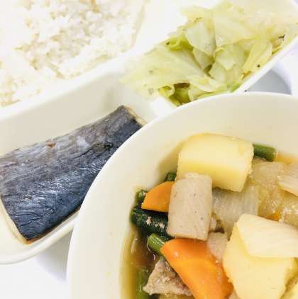 「ごはん」「さごしの塩焼き」「豚肉とじゃがいもの煮もの」「キャベツの梅風味」「牛乳」です