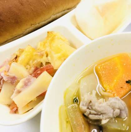 「黒糖パン」「鶏肉とてぼ豆のスープ煮」「じゃがあいもとトマトのチーズ焼き」「なし(二十世紀」「牛乳」です