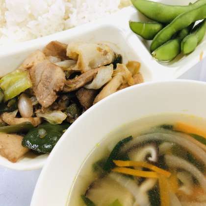 「ごはん」「ホイコウロー」「中華スープ」「えだまめ」「牛乳」です