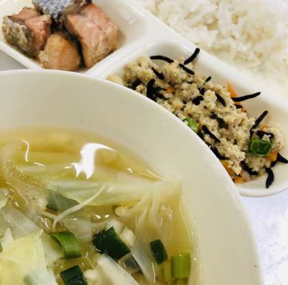 「ごはん」「さけのしょうゆ風味焼き」「五目汁」「高野どうふのいり煮」「牛乳」です