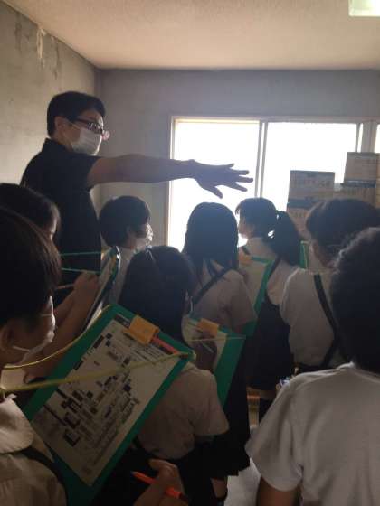 みんなで地図を持って学校の中を見て回りました。最後に備蓄倉庫を見ました。中には、水や食料、毛布など災害時に必要なものがたくさんありました。備蓄倉庫は4階にあり、「津波で流されないように考えているんだな。」と気づく子もいました。