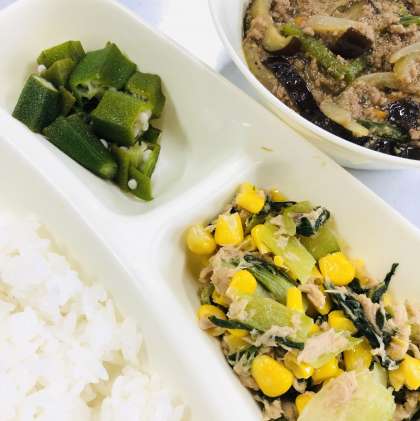 「ごはん」「マーボーなす」「オクラの甘酢あえ」「ツナとチンゲンサイのいためもの」「牛乳」です