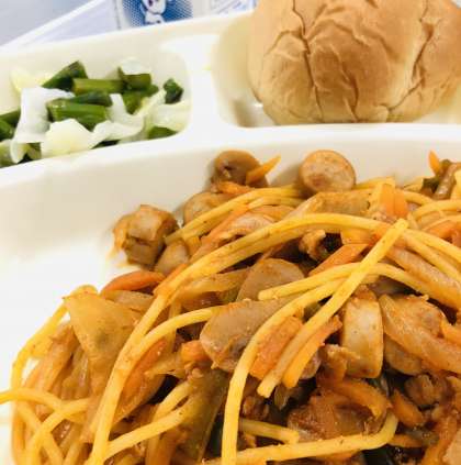 「黒糖(小)パン」「イタリアンスパゲッティ」「イタリアンスパゲッティ」「グリーンアスパラガスとキャベツのサラダ」「牛乳」です