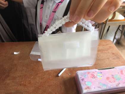 今日は、管理作業員さんや保健室の小谷先生にも協力いただき、感染症対策グッズや避難所で使えるグッズを作りました。