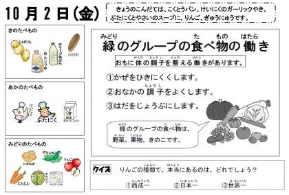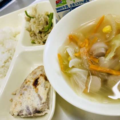 「ごはん」「かつおのマリネ焼き(ノンエッグドレッシング)」「ウインナーと野菜のスープ」「もやしとピーマンのソテー)」「牛乳」です