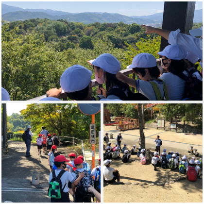 錦織公園では、まず河内の里を見学し、次に展望台に登りました。金剛山などがよく見え、子どもたちはとても喜んでいました。