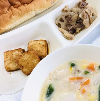 「おさつパン」「はくさいのクリーム煮」「あつあげのピリ辛じょうゆかけ」「豚肉とれんこんのオイスターソースいため」「牛乳」です
