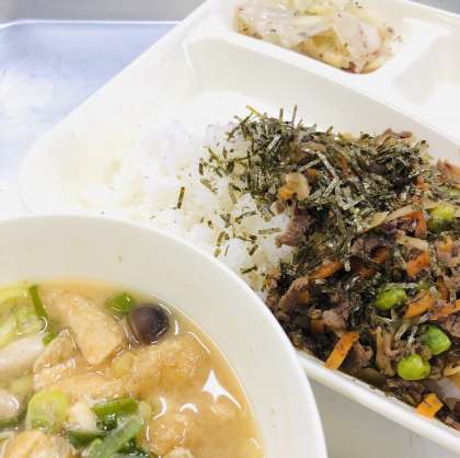「牛肉のきんぴらちらし」「みそ汁」「キャベツの赤じそあえ」「牛乳」です