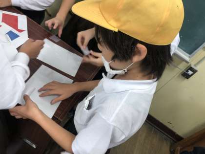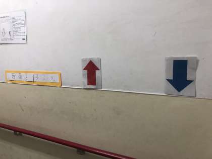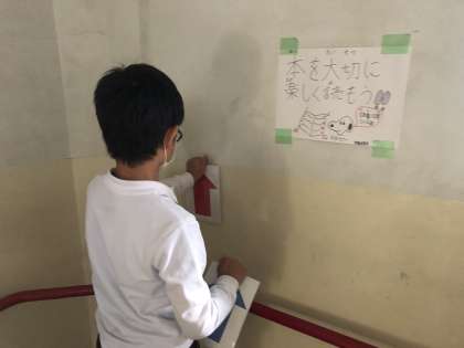 代表委員会では、みんなが安全に学校生活を送れるように、「右側通行を守ろう!」の取り組みを行っています。階段に矢印を貼ったり、ポスターを作ったりとみんなが右側を歩くことができるように考えました。休み時間にも毎日放送で呼びかけています。