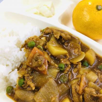 「ポークカレーライス(米粉)」「はくさいのピクルス」「みかん」「牛乳」です