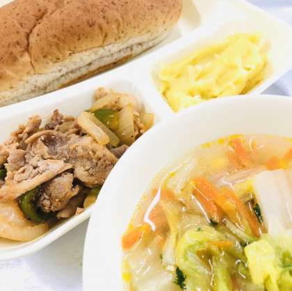 「ライ麦パン」「豚肉と野菜のケチャップソテー」「スープ」「スイートポテト」「牛乳」です