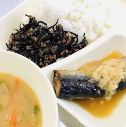 「ご飯」「さんまのみぞれかけ」「みそ汁」「牛ひじきそぼろ」「牛乳」です