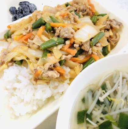 「ピリ辛丼」「中華スープ」「ソフト黒豆」「牛乳」です