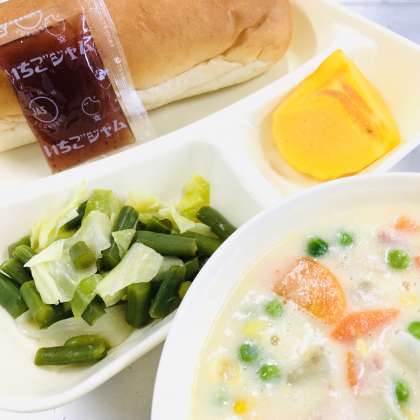 「コッペパン」「いちごジャム」「コーンクリームシチュー(米粉)」「キャベツとさんどまめのサラダ」「かき(平核無柿」「牛乳」です