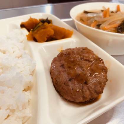 「ご飯」「和風ハンバーグ」「みそ汁」「かぼちゃのいとこ煮」「牛乳」です
