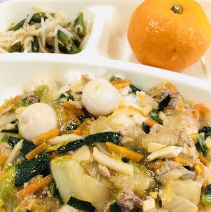 「中華丼」「もやしとさんどまめの中華あえ」「みかん」「牛乳」です