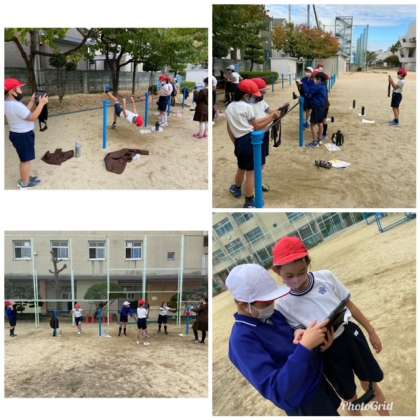 今日は、ペアになってタブレットで動画を取り、自分や友だちの鉄棒をしている様子を確認しました。