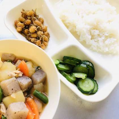 「ご飯」「鶏肉と野菜の煮もの」「じゃこ豆」「あっさりきゅうり」「牛乳」です