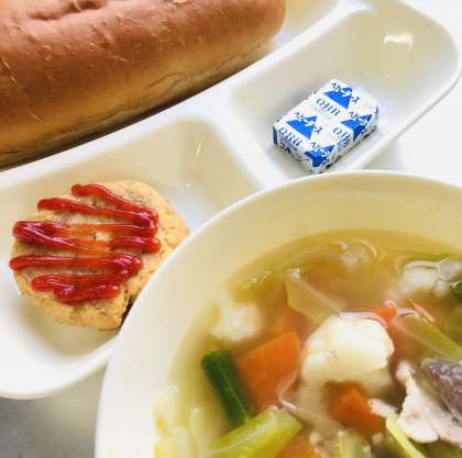 「黒糖パン」「とうふハンバーグ」「カリフラワーのスープ煮」「固形チーズ」「牛乳」です