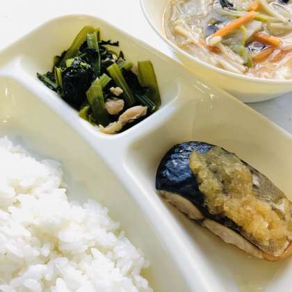 「ご飯」「さばのみぞれかけ」「みそ汁」「こまつなの煮びたし」「牛乳」です