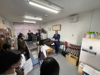 本日,本校の校長室で「税に関する習字」の表彰式がありました。表彰式のために西成税務署から署長の方が来校されました。
