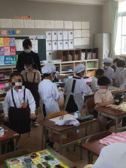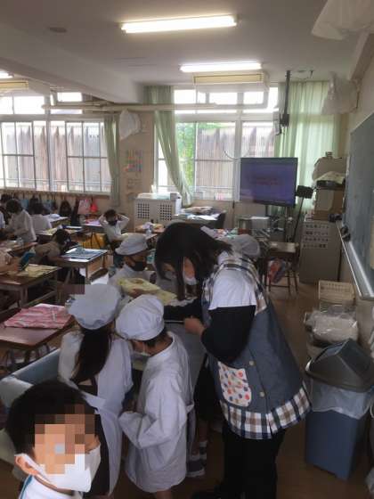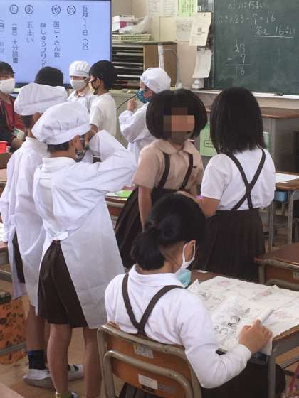 子どもたちはコロナ禍の短縮授業中でも、給食の時間には、それぞれが協力して準備し、楽しく、おいしくいただいています。