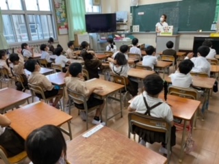 1年生は、さわらびの先生に「さわらびの おともだち」についての紙芝居を読んでもらいました。自分のことは自分でする、困っていたら助け合うなど学校で生活する中で大切なことがたくさんわかりました。