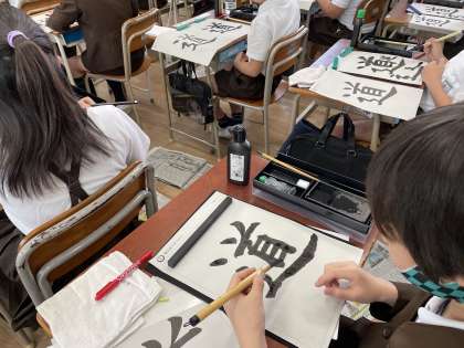 学習する字は「道」です。はじめに、試し書きをしました。自分の字とお手本の字を見比べると、「はらいにもっと気をつけよう」「穂先を意識しよう」などの課題が見つかったようです。