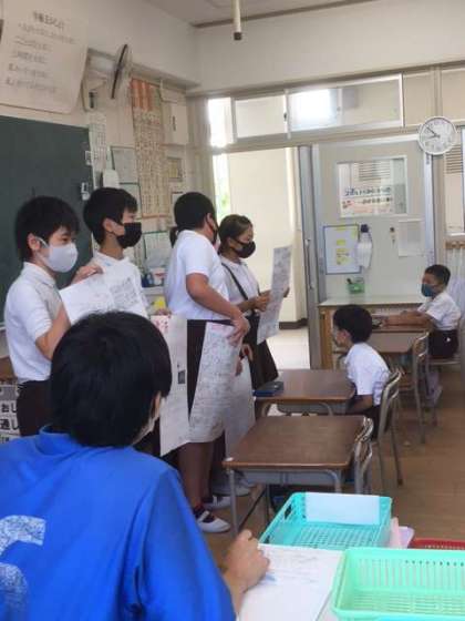 地震や津波など、災害について自分たちが学んだことをポスターにまとめて、2年生の教室に伝えに行きました。学校のリーダーとして活動する姿が低学年の良い見本となっています。