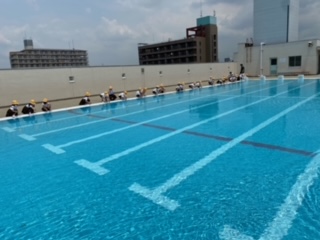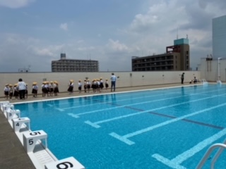 1時間目には、持ち物の記名チェックなどを行いました。4時間目は、実際にプールに行ってタオルの置く場所や、シャワーの使い方など色々な説明を聞きました。