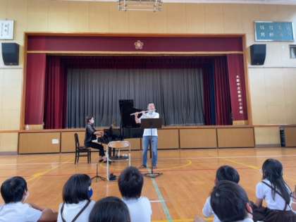 今日は大阪フィルハーモニー交響楽団のみなさんのコンサートがありました。フルートとピアノの綺麗な音色にみんなうっとり。クラシックの名曲から、みんなが知ってるアニメの曲まで、色々な曲を演奏していただきました。