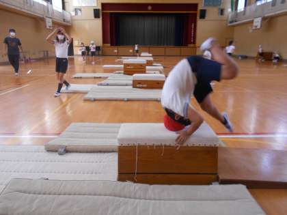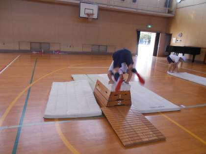 足を開いて跳ぶ「開脚跳び」のほかに、跳び箱の上で前転をする「台上前転」にもチャレンジしています!