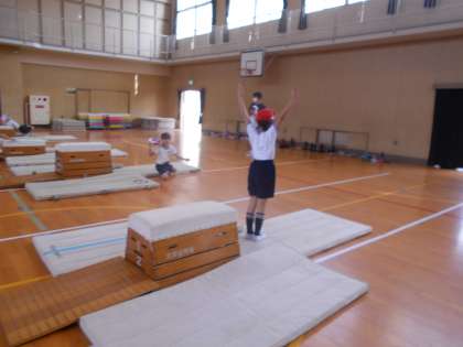 初めは台の上で前転をすることが不安だった子も、低い段からチャレンジしていき、だんだんと自信をもって取り組めるようになってきました。