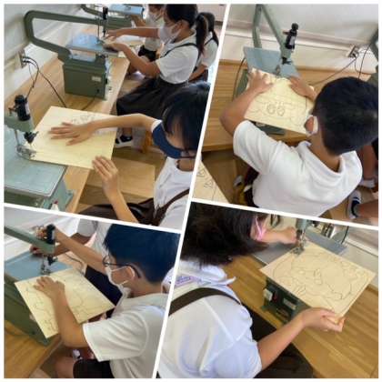 それぞれのデザインに合わせて電のこで板を切っていきます。最初はおそるおそる動かしていた子ども達ですが、授業の終わりにはすいすい切っていました^^