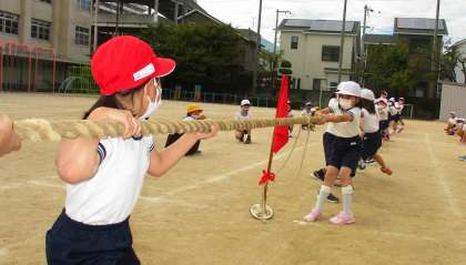 赤組も白組も一生懸命綱を引き、結果は、2対2で引き分けでした!良い勝負です。