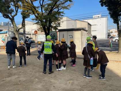 地域の方にご協力いただき、南津守の町の災害時に安全な場所、危険な場所を見つけることができました。子どもたちは事前に学習した、津波避難ビルや、消火器・消火栓などの防災設備、いざというときに使うAEDなどが「こんなにたくさんあるんだね。」と驚いた様子でした。