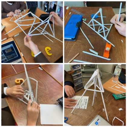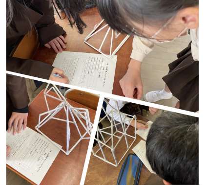 今日、図工の鑑賞会をしました。紙で作った細い棒をつなぎ合わせ、いろいろな形を作りました。工夫しているところや見てもらいたいところを作品カードに書いたり、「すごい、ブランコみたいになってる!」「形がハートみたい!」など、互いに感想を伝え合ったりしました!