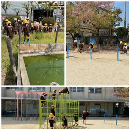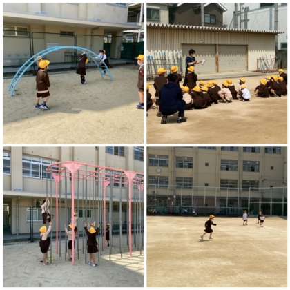 2時間目には運動場に出て、運動場での遊び方、行ってはいけないところなどを確認した後、1組も2組も一緒になって運動場で遊びました。