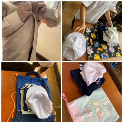 授業では、今日は体操服に着替える練習をしました。脱いだ服を脱いだ順番にきれいにたたむことができましたよ!!
