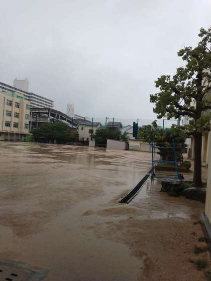 雨がふってきました。誰もいない運動場はさびしいですね。