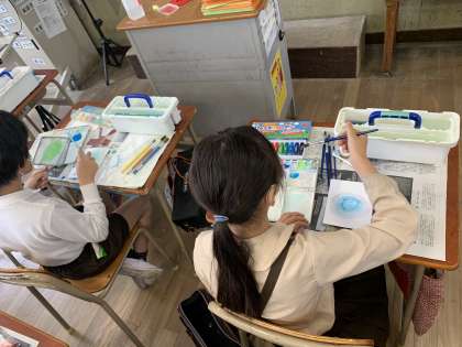 筆を使うだけでなく、ブラシと網で霧を吹いたようにしたり、水を先に落としてから絵の具をにじませたりして、思い思いに描いています。