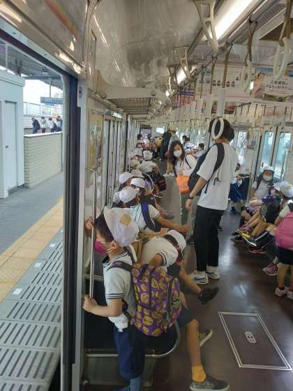 学校に帰ります。電車の中では静かに、行儀良くしています。