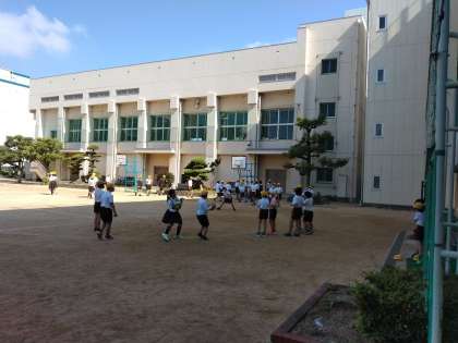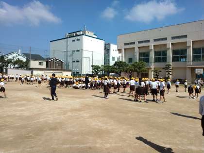 朝から子どもたちは元気いっぱいです。チャイムがなると児童集会の形にならびます。