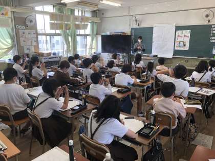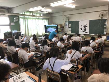 最初の文字は「道」でした。しんにょうのバランスを意識して筆を進めました。静かな教室で集中して取り組むことができました。