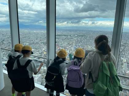 電車からは大阪市の街並みを見学し、あべのハルカスでは、高い場所から見える大阪の様子を見学しました。みんなワークシートに一生懸命取り組んでいました。