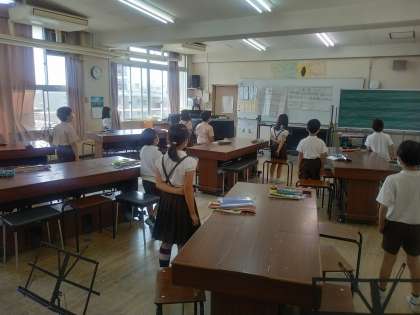 3年生の音楽です。コロナ対策のため、教室と、音楽室にわかれています。