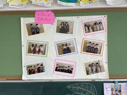 エプロンがようやく完成しました。ミシン縫いもどんどん上達し、下糸の巻き方も上糸のかけ方もバッチリです!まだお家には持って帰りませんが、持ち帰った際に、子どもたちの頑張りを見てあげてください!