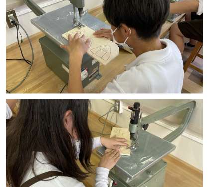 図工では、テープカッターを作っています。電ノコの使い方を思い出しながら、慎重に木を切っていました。完成はまだ先ですが、立派な作品に仕上げたいと思います!