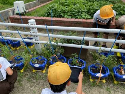 2年生が育てているミニトマト・サツマイモ・ナスが大きく育っています。