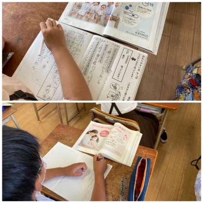 国語は、7月から「広告を読みくらべよう」の学習に入っています。同じ商品でも違う2種類の広告を見て、表し方や写真の違いについて比べながら学習しています。子どもたちは普段、町の中で見ていた広告にもたくさんの工夫がされていることに気がついていました。